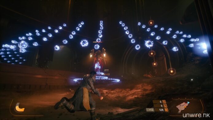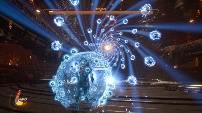 遊戲除了有射擊感之外,更有傳統日製戰機射擊遊戲,要避開敵方子彈彈幕的刺激感。玩家必須在三種不同顏色的致命彈幕中穿梭閃避。藍色彈幕最為基本,玩家可以開啟護盾將其吸收並轉化為武器能量;黃色的「侵蝕彈體」則是一把雙面刃,雖然同樣能吸收轉化能量,但代價是會暫時扣除玩家的最大生命值上限,極度考驗玩家的風險控管能力。最為致命的紅色「新星彈體」則無法閃避與吸收,在遊戲初期玩家只能憑藉左搖桿精準走位,直到中期獲得反彈技能後,才能以近戰將其擊回。這種結合了閃避、格擋、吸收與反擊的高強度戰鬥循環,帶來了獨特的爽快感。