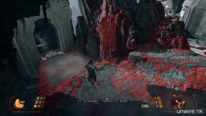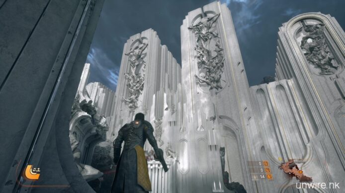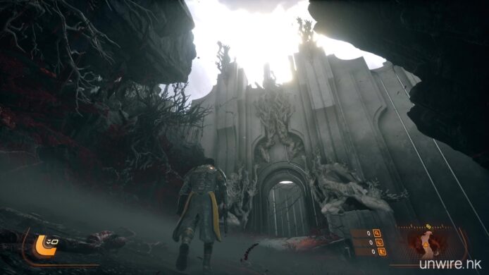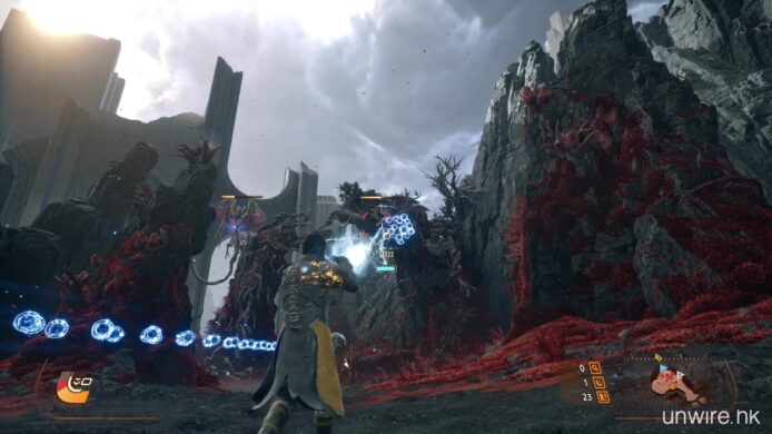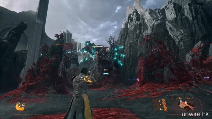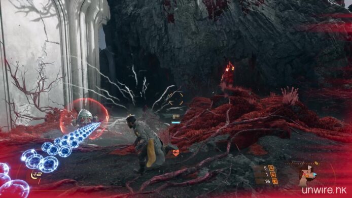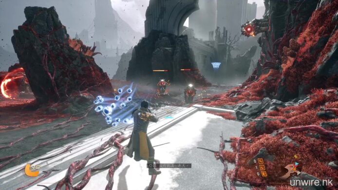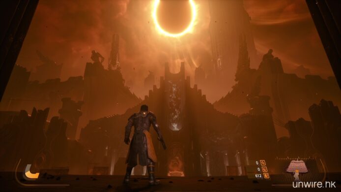 遊戲亦強調運用了 PS5 的硬件特性。《沙羅週期》受惠於超高速 SSD 的加持,無論是地貌在日蝕下的變換,還是死亡後的重新出發,幾乎感覺不到任何載入時間。而遊戲畫面即使充滿了霓虹粒子特效彈幕,依然能維持流暢的 60 FPS 表現,也是我們率先試玩體驗到的好處。
